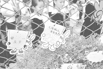 ②张贴在北京曙光小学护栏上的由师生们自己书写的安全提示卡。 苑振兴摄
