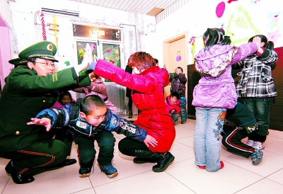 为强化孩子们避震防灾的意识和方法,让孩子们学会在灾难中保护自己,山东省东营市东营区广利港利用寒假,聘请东营边防支队广利港派出所的民警到辖区学校和幼儿园指导儿童进行防灾减灾训练。图为广利港派出所的民警叔叔与幼儿园小朋友一起做防震游戏。本报记者 刘新武摄