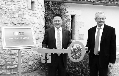 图为2月16日,法国雷沃堡酒庄原产权人菲利普·拉乌(右)在法国波尔多向中粮集团副总裁迟京涛转交象征产权的钥匙。 新华社发