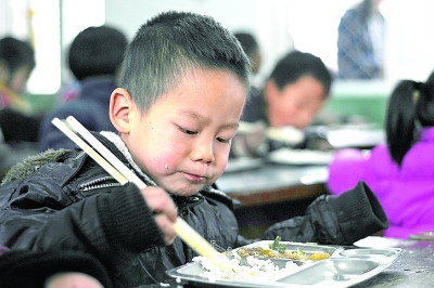 11月29日中午,河南省平顶山市鲁山县瓦屋乡刺坡岭村瓦屋第五中心小学学前班5岁的张玉飞,第一次在学校吃到了美味的免费午餐。当日,该校作为平顶山市第三所“免费午餐”小学正式开伙。