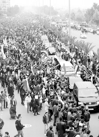 2月7日,在叙利亚首都大马士革街头,部分叙利亚民众夹道迎接俄罗斯外长拉夫罗夫的车队。当日,俄罗斯外长拉夫罗夫访问叙利亚。