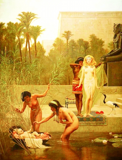 在这件作品中,英国画家以“发现摩西”为主题,用新古典主义的手法,向我们展现了其眼中充满异国风貌而又别具田园气息的埃及风情。作品色调和谐,以暖棕色处理,既表现了埃及的地理气候特点,又表现了公主发现可爱的婴孩摩西的快乐。