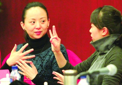 | 3月4日,全国政协十一届五次会议分组讨论在各驻地举行。全国政协委员、以舞蹈“千手观音”感动世人的中国残疾人艺术团团长邰丽华通过观看手语翻译“聆听”两会。本报记者 郭俊锋摄 |