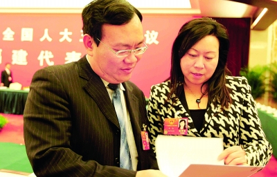 | 3月4日,出席十一届全国人大五次会议的福建代表团王晶代表(右)和戴仲川代表在一起商议《关于加大科技型中小企业支持力度的建议》。本报记者 刘新武摄 |