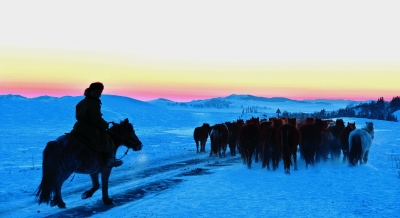 没来坝上之前,想象着在蓝天白云之下,一望无际的草原上,成群的牛羊、奔腾的骏马和有着娴熟骑术的牧民策马驰骋的英姿,没想到的是,冬季的坝上更让人神往。我满怀朝圣般的虔诚,拜访了这块心目中的圣地。清晨,我踏雪而行,站在零下40摄氏度的寒风中用相机收获着大自然馈赠的“礼物”;傍晚,围坐在羊肉火锅旁喝着浓烈的65度白酒,热情的主人为我的房间开好了暖气,伴随着窗外呼啸的寒风和客房里的呼噜声进入了梦乡。