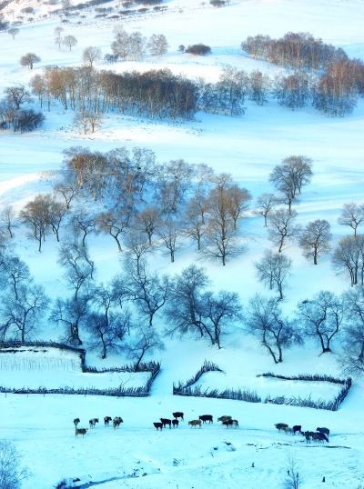 冬季的内蒙古乌兰布统坝上草原,皑皑白雪玉树琼花,悠闲的牛羊如同雪地的精灵在丘陵间缓缓漂移,原本绿色的大草原飞舞漫天的诗意,平添许多神韵。纷纷扬扬的雪花,像春天的柳絮亲吻着摄影人的脸。草原像一位母亲,无私地敞开胸怀哺乳着一代又一代蒙古子孙。在这里,雪域的空气干净,不染纤尘;在这里,仿佛走进童话般的世界,净化着都市的尘埃。