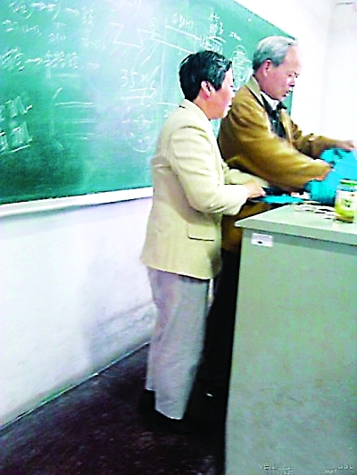 今天,记者跟随章教授夫妇来到了教学楼。此时离上课还有半个小时,章教授拉着老伴儿的手,将她安置在教室的最后一排,自己则打开印有学校标志的蓝色旧手袋,取出课本,做上课前的准备。同学们都陆续到了。