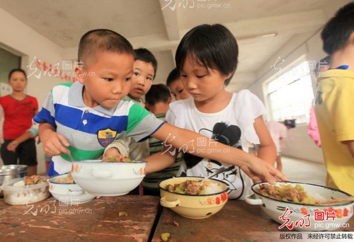秋季开学前广西壮族自治区教育厅为保障农村义务教育学生营养改善计划的实施,出台了农村中小学生一周参考食谱并配发使用说明,学生在校期间每天午晚餐标准为米饭配两菜一汤,对每餐的米饭、肉等制订了具体标准。图为9月3日,秋季学期开学的第一天,在广西柳州市融安县大坡乡中心小学,学生们在排队领取免费午餐。