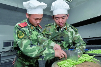 2012年7月,来自中国人民大学应届毕业的90后国防生蔡啸天(右)被分配到武警淮北支队,开始了基层部队生活。为了实现从国防生到基层一线带兵人的身份转变,他充分利用自己在大学所学的专业知识,积极投入到部队生活的方方面面,并与战士们进行深入交流。图为蔡啸天向炊事班班长学习刀功。新华社发(张端摄)
