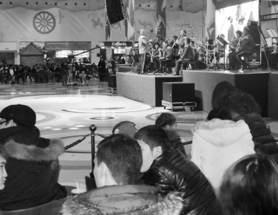 | 市民们一边购物一边观看音乐歌舞节目。 |