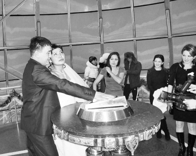 | 在阿斯塔纳市巴伊杰列克观景塔顶层,一对年轻人在祈求平安幸福。该塔是哈萨克斯坦首都的象征,被称为“生命之树”。 本报记者 赵和平摄 |
