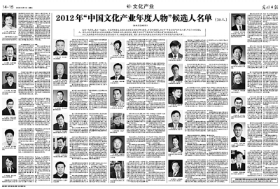 在30人候选名单中,有些名字是那样的熟悉,他们刚刚出现在2012年9月的“全国文化体制改革工作表彰会”上。中国出版集团公司总裁谭跃、北京演艺集团有限责任公司董事长康伟、中国对外文化集团公司董事长张宇、山西清徐嫦娥文化艺术有限公司董事长胡嫦娥、中国传媒大学文化发展研究院院长范周等多位候选人获得了“全国文化体制改革先进个人”称号;而梁光伟领导的深圳华强集团、郑凡带领的华侨城集团、杜金卿旗下的河北出版传媒集团荣获“全国文化体制改革先进单位”……