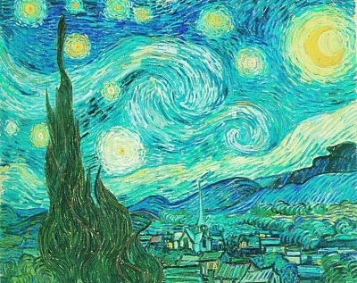 梵高眼中的夜空,是一片奔腾翻滚的能量。剧烈爆发的星光之下,村庄安宁静寂。大地的天空交界处,是火焰般燃烧的柏树——那是习惯上与死亡与哀悼冥冥相联的植物。但于梵高而言,死亡并非不吉利之事。“仰望星空常常让我陷入梦境,”他说:“为什么?我问自己,为什么天空闪烁的亮点,不能像地图上的标记那样,让人接近?人又为何如此祈望,能搭着死亡之车奔向星星。”