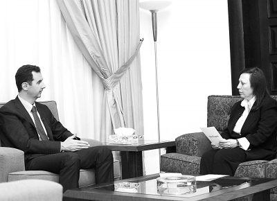10月3日,叙利亚总统巴沙尔·阿萨德(左)在首都大马士革接受叙利亚官方报纸《十月报》的采访。叙利亚官方的《十月报》6日刊登总统巴沙尔·阿萨德接受该报采访内容,巴沙尔表示,叙政府绝不会在日内瓦叙利亚问题国际会议上与“恐怖分子”进行谈判。新华社∕叙通社