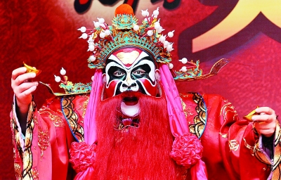 2月1日,演员李永顺在长沙火宫殿古戏台上为市民表演《财神送福》。新华社记者 龙弘涛摄