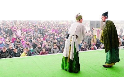2月2日,在安徽省阜阳市清河广场上,戏剧团演员在为市民演出。 新华社记者 郭晨摄
