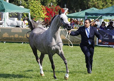 | 2月13日,在阿联酋阿布扎比举行的2014阿拉伯纯种马“选美”国际锦标赛上,一名驯导员牵领参赛马匹展示奔跑姿势。 新华社发 |