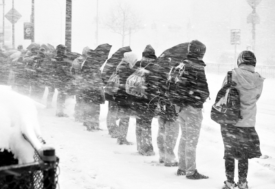 | 2月13日,美国东部地区遭遇暴风雪,首都华盛顿以及纽约、波士顿等大都会地区居民的出行和生活受到严重影响,10余个州的逾50万户居民及商业用户断电。图为市民在美国纽约皇后区一处公交车站冒着暴风雪等待乘车。 新华社发 |