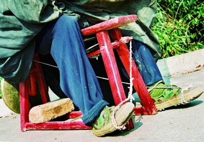 “嘿嘿,放下担子搭起台,锣鼓一响有人来;讨个铜钱要碗米,唱出猴王打妖怪!”刘永安一边念顺口溜,一边起身往屋里走。片刻,就把曾经跟随他走过数十个风雨春秋的那副老戏担搬了出来,一一摊开让我们看。虽然陈旧破烂不已,终究还是“满朝文武满朝臣”,样样俱全。最最让我眼亮的,却是那木偶头像的雕刻造型和绘彩,均系刘永安亲手所为。所有木偶都一袭古朴的粗陋、土俗和稚拙,可算原汁原味的民间艺术了。