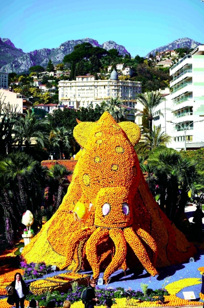由这个传说,人们感恩于天地的厚待,先人的遗泽,引出了芒通柠檬狂欢节,今年已是第81届了。我纳闷的是:难道二战的炮火也没能让他们暂停歌舞升平吗?那这个城市、这个民族需要多大的浪漫值啊。柠檬节每年有一个主题,2014年的主题是法国科幻小说作家儒勒·凡尔纳的《海底两万里》,城中柠檬园里立着巨大的水果景观雕塑“海底大章鱼”,大街上到处摆摊卖柠檬和橘子,售价还略高于超市。有意思的是,芒通狂欢节巡游花车上,“没有一朵鲜花”,花车上的演员无花可撒,又不能乱扔柠檬橘子砸着人,只好撒彩色纸絮。海水的蓝、柠檬的黄,配合着充沛的阳光,让人感觉舒爽极了。