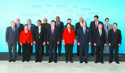 会晤开始前,习近平与罗塞夫共同迎接出席会晤的拉美和加勒比国家领导人和代表,同他们一一握手并集体合影。