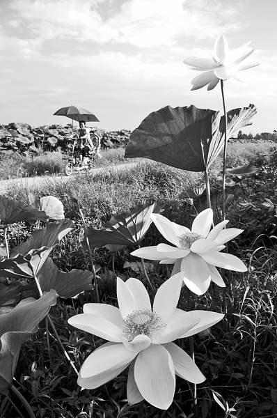 7月18日,在山东省临沂市郯城县马头镇梁村,路人从盛开的“复垦莲花”旁经过。近日,该镇通过复垦种植的1000多亩莲花进入盛花期。近年来,郯城县加大对农村废弃坑塘的开发利用,引进优质莲花,成立莲藕种植专业合作社,进行莲藕深加工,使荒废坑塘变成致富“聚宝盆”。新华社发(房德华摄)
