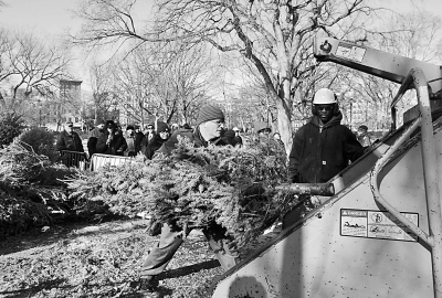 1月8日,在美国纽约汤普金斯广场公园,工作人员将回收的圣诞树放进绞碎机里。当日,纽约市卫生局和公园局联合举办回收圣诞树活动。这些从市民家中回收的圣诞树将被制成混合肥料,在全纽约市的公园、球场及社区花园里使用。 新华社发