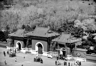 4月6日,施工人员在沈阳昭陵古建筑上安装防雷带。当日,世界文化遗产——沈阳昭陵避雷工程正式启动,工程为期三个月。施工人员将为沈阳昭陵内古建筑更换紫铜材料防雷带。此次施工采用简便、高效、安全的新型焊接工艺,同时将设置170多处新型接地装置,可将雷电更好地导入地下。新华社发(张文魁摄)