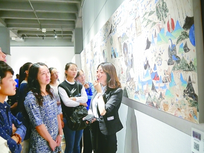 9月2日,由中国敦煌石窟保护研究基金会、敦煌研究院和西北师范大学联合举办的“敦煌壁画艺术精品高校公益巡展”走进西北师范大学。通过现代数字技术复制后的40余幅敦煌石窟和瓜州榆林石窟经典作品,再现了敦煌艺术的神韵。图为来自敦煌研究院的专业讲解员在为观众讲解。