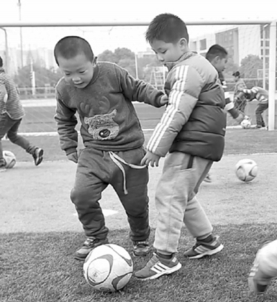 4月5日,刚刚结束清明小长假的江苏省扬州市邗江实验学校新盛校区一年级的学生们,又重新回到校园的操场上,感受足球运动带给他们的快乐。目前,该校8000多名中小学生,班班有足球队,每周一节足球课;并聘请专业足球教练为孩子们执教,让每一个学生都能感受到踢足球的快乐。图为一年级学生在操场上练习足球。庄文斌摄/光明图片