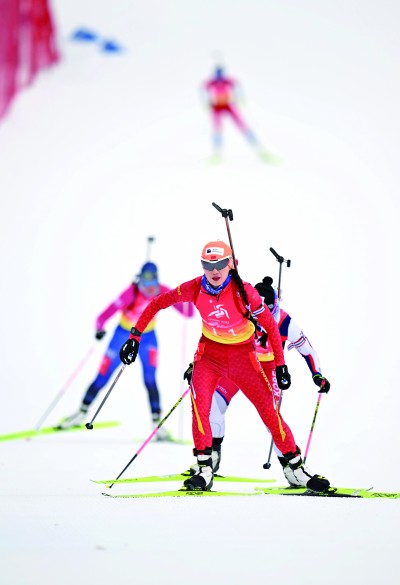 2月13日,中国队选手唐佳琳(前)在冬季两项女子4×6公里接力比赛中。新华社发