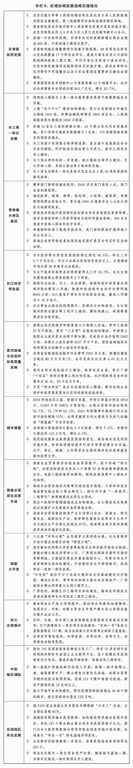 一是区域协调发展积厚成势。京津冀协同发展走深走实,在京相关高校、医院、中央企业总部及二三级子公司分批向雄安新区疏解,北京城市副中心行政办公、商务服务、文化旅游等功能不断完善,进一步支持天津滨海新区高质量发展若干政策措施出台实施,三省市互联互通交通网络更加完善、产业链上下游协作持续强化、公共服务共建共享水平进一步提升。长三角一体化高质量发展深入推进,生态绿色一体化发展示范区改革授权压茬推进,港口资源整合、轨道互联互通等取得新进展,上海“五个中心”建设进一步加快。粤港澳大湾区建设迈上新台阶,横琴粤澳深度合作区封关“一线”“二线”分线管理运行顺利,超1.6万名澳门居民在合作区居住生活,支持河套深港科技创新合作区深圳园区、香港园区联动发展,创新要素跨境流动更加便捷。长江经济带共抓大保护、不搞大开发成效显著,进一步抓实抓好长江大保护工作三年行动计划出台实施,长江十年禁渔取得明显成效,长江干流连续5年保持Ⅱ类水质,综合立体交通走廊加快构建,沿江高铁全线开工建设。黄河流域生态保护和高质量发展迈出坚实步伐,农业面源、城镇生活、工业和尾矿库污染治理深入推进,8万余个入河排污口开展溯源整治,一批生态保护修复重点项目加快建设,黄河干流连续3年保持Ⅱ类水质。海洋强国建设深入推进,海洋强省、现代海洋城市、全国海洋经济发展示范区创新发展,海洋生态环境质量持续改善,海洋生产总值超10万亿元。