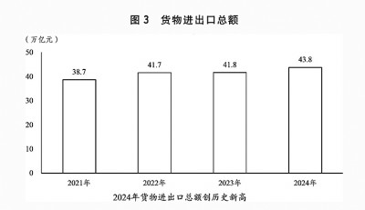 (六)加快建设更高水平开放型经济新体制,高水平对外开放取得积极成效。全年货物进出口总额43.8万亿元,服务进出口总额7.5万亿元,外商直接投资1162亿美元,境外直接投资1438亿美元。年末外汇储备规模达32024亿美元。(见图3)