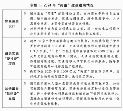 二是发行超长期特别国债支持“两重”建设取得积极进展。着眼于系统解决强国建设、民族复兴进程中一些重大项目建设的资金问题,从2024年起发行超长期特别国债支持国家重大战略和重点领域安全能力建设。坚持自上而下、软硬结合,建立实施项目储备、集中联审、专款专用、强化监督等全链条推进保障机制。“硬投资”方面,严格做好项目筛选,2024年安排7000亿元超长期特别国债支持1465个重大项目建设,项目基本全部开工、全年完成投资超过1.2万亿元。“软建设”方面,坚持项目建设和配套改革相结合,扎实推进规划编制、政策制定和体制机制改革创新,不断完善投入机制、提高投入效率。规范项目全过程管理方面,出台“两重”建设有关管理办法,督促项目加快开工建设,严格资金监管,加强监测调度和现场监督检查,确保建成优质工程、精品工程、放心工程。(见专栏1)