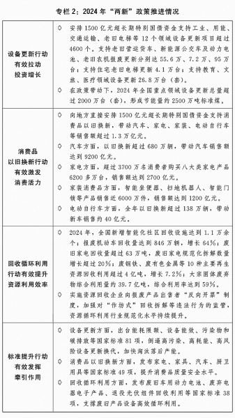 三是大规模设备更新和消费品以旧换新政策落地见效。印发“两新”行动方案,出台工业、建筑市政、交通、农业、教育、文旅、医疗等七大领域设备更新实施方案和消费品以旧换新、回收循环利用、标准提升引领行动方案。安排3000亿元超长期特别国债加力支持“两新”工作。2024年,“两新”政策带动全国设备工器具购置投资增长15.7%,高于固定资产投资(不含农户)增速12.5个百分点;限额以上单位家用电器和音像器材类、家具类商品零售额分别增长12.3%、3.6%,带动大宗耐用消费品销售额超过1.3万亿元;消费品以旧换新活动中,新能源汽车销量占比超过60%,一级能效家电销售额占比超过90%。(见专栏2)
