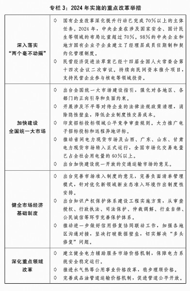 三是促进各种所有制经济优势互补、共同发展。高质量完成国有企业改革深化提升行动。实施国有经济布局优化和结构调整指引,完善国有企业分类、分行业考核评价体系,深入推进战略性重组和专业化整合。落实民营经济促进法,加快配套制度建设。进一步加大拖欠企业账款清偿力度,建立拖欠企业款项信用监管机制。开展加力帮扶小微企业纾困解难专项行动,用好支持小微企业融资协调工作机制。健全企业信用状况综合评价体系,提升融资信用服务平台质效。完善全国中小企业服务“一张网”,加强个体工商户分型分类精准帮扶。持续推动完善中国特色现代企业制度。
