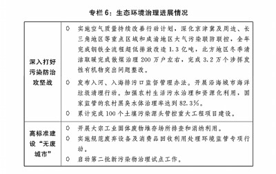 一是生态环境质量持续改善。深入打好蓝天、碧水、净土保卫战,全国地级及以上城市细颗粒物(PM2.5)平均浓度为29.3微克/立方米、下降2.7%,空气质量优良天数比率为87.2%;地表水质量达到或好于Ⅲ类水体比例为90.4%,城市生活污水集中收集率76.6%;化学需氧量排放量、氨氮排放量、挥发性有机物排放量、氮氧化物排放量持续下降。印发土壤污染源头防控行动计划。深入实施环境基础设施建设水平提升行动,强化塑料污染和过度包装全链条治理,深入推进快递包装绿色转型。(见专栏6)