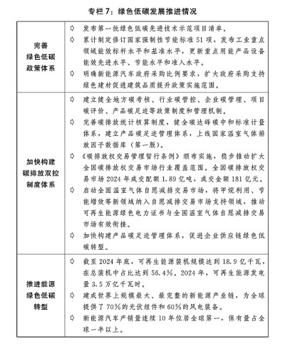 三是加快推动绿色低碳发展。持续构建碳排放双控制度体系,制定出台碳达峰碳中和综合评价考核办法,建立健全碳排放统计核算制度、碳排放预算管理制度、产品碳足迹管理体系、产品碳标识认证制度,丰富完善国家温室气体排放因子数据库。推动全国碳排放权交易市场、温室气体自愿减排交易市场、绿色电力证书市场建设。发布第二批绿色低碳先进技术示范项目清单,扎实开展第二批国家碳达峰试点,出台零碳园区建设方案。延长碳减排支持工具实施年限至2027年,有序推进碳金融产品和衍生工具创新,发展绿色保险。有力有效管控高耗能高排放项目,加快推动重点领域节能降碳改造和用能设备更新,加强重点用能单位节能管理,完善节能降碳标准体系,深入实施能效标识制度。健全资源环境要素市场化配置体系。营造绿色低碳产业健康发展生态,培育绿色建筑、绿色能源、绿色交通等新增长点。加强煤炭绿色智能开发、清洁高效利用。统筹新能源开发与消纳,有力有序推进集中式和分布式新能源健康发展,加快“沙戈荒”新能源基地建设,有序开发建设海上风电基地,统筹就地消纳和外送通道建设。大力实施可再生能源替代行动。推进煤电低碳化改造示范。进一步规范新型储能并网管理,持续完善调度机制。实施全面节约战略,持续推动“能水粮地矿材”一体化节约,深入实施国家节水行动。大力发展循环经济,加强废弃物循环利用,推广再生材料使用。