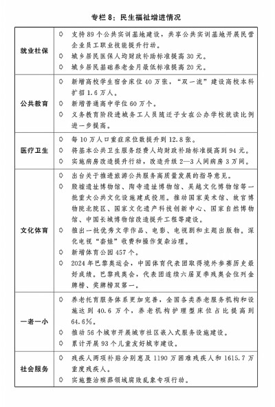 三是促进公共服务普惠均衡。完善国家基本公共服务制度体系,创新和完善普惠均衡的公共服务供给方式。实施医疗卫生强基工程,提高基层医疗卫生机构服务能力。加强国家医学中心、国家区域医疗中心建设和规范管理,支持妇幼保健和疾控机构建设。充分发挥中医药防病治病优势和作用,持续实施中医药振兴发展重大工程。加强护理、儿科、病理、全科、老年医学专业队伍建设。加强省级精神专科医院或综合医院精神病区建设,支持公立医疗机构提供心理咨询等心理健康服务,提升心理健康和精神卫生服务能力。深入实施积极应对人口老龄化国家战略。支持公办养老机构建设护理型床位,加大养老护理人员培训力度,增强居家、社区、机构等不同服务形态照护服务功能,多措并举促进普惠养老服务高质量发展。加快建立长期护理保险制度,强化以失能老年人照护为重点的基本养老服务。加快发展智慧养老。全面开展早孕关爱服务,科学规划托育服务体系,发放育儿补贴,大力发展托幼一体服务,抓好普惠托育服务发展示范项目实施。推进城市社区嵌入式服务设施建设。持续推动家政服务业提质扩容。完善全民健身公共服务体系,广泛开展全民健身活动,推进群众身边的运动场地建设,办好第十五届全国运动会。加强社会福利服务设施建设,强化殡葬的公益属性。提升公共法律服务均衡性和可及性。建设更高水平的平安中国。