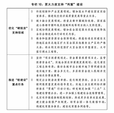 三是加力推进“两重”建设。进一步完善自上而下的工作机制,加强“两重”建设项目储备,更好统筹“硬投资”与“软建设”。安排超长期特别国债8000亿元支持“两重”建设,进一步优化具体投向并提高项目支持比例,重点支持基础研究能力提升、未来产业发展、东北等重点地区高标准农田建设、大中型灌区新建改造及大中型引调水和大中型水库建设、长江经济带生态环境保护和绿色发展、农业转移人口市民化公共服务体系建设、高等教育提质升级、城市地下管网管廊建设改造等方面任务,强化超长期贷款等配套融资,高质量推进“硬投资”项目谋划实施。加大力度推动“软建设”政策落地见效。(见专栏10)