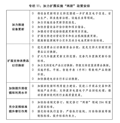 四是加力扩围实施“两新”政策。安排超长期特别国债5000亿元支持大规模设备更新和消费品以旧换新,统筹投资、财政、金融等综合性政策,深入推进设备更新、消费品以旧换新、回收循环利用、标准提升四大行动。进一步加大重点领域设备更新项目支持力度,加力实施设备更新贷款贴息,加快存量设备评估诊断和项目储备。进一步支持消费品以旧换新,扩大汽车报废更新支持范围,完善汽车置换更新补贴标准,实施手机、平板等数码产品购新补贴,积极支持家装消费品换新,简化补贴申领和支付流程,完善资金监管机制,严厉打击价格欺诈和违规骗补套补行为。(见专栏11)