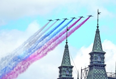 5月9日,在俄罗斯首都莫斯科,参加纪念苏联伟大卫国战争胜利80周年阅兵式的战机编队拉烟飞行。新华社发
