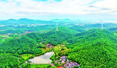 5月9日,安徽省铜陵市枞阳县枞阳镇青山村,绿水青山与白云、风车、农田、民居等相映成景,构成一幅绿色生态新农村画卷。刘伯顺摄/光明图片
