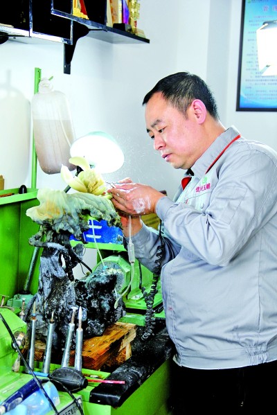 玉粉在灯光下扬起,弥漫出柔和的雾。辽宁省岫岩满族自治县佳兴玉器厂设计总监孙佳兴微微探身,指腹贴着玉面,一寸寸摸索走刀的方向。钻头落下,萝卜根须的轮廓,在他指尖缓缓呈现。