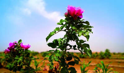 盛夏时节,在一望无垠的塔克拉玛干沙漠南缘,绵延起伏的沙丘背后,一片葱翠的玫瑰园映入眼帘。微风轻拂,几点微红在沙海中翩跹起舞,像是在金色的海浪上飞舞的红色珍珠。