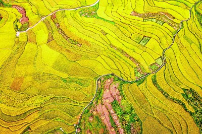 时下,贵州省毕节市大方县小屯梯田迎来丰收季,层层叠叠的稻田披上金装,风光壮美。图为9月24日拍摄的小屯梯田一隅。李华摄/光明图片