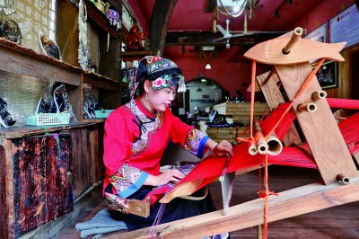 土家十三寨位于小南海地质公园内的小南海镇新建村。这里由13个土家寨子组成,是首批中国少数民族特色村寨。“当西兰卡普的千年经纬遇上现代时尚,让土家织锦获得了新生。”黔江区非物质文化遗产保护中心主任华启元说,土家十三寨设立西兰卡普非遗工坊,把非遗技艺与乡村振兴相结合,聘请非遗技艺大师对村民进行培训,促进村民就业增收。