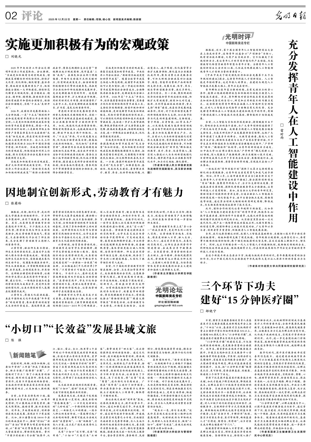 2026年,我国经济发展将面临三大全新机遇:一是“十五五”规划的开启和适度超前布局将打开全新增长空间;二是更加积极的财政政策和宽松的货币政策蓄势待发,将进一步支撑经济回升向好;三是微观市场主体的资产负债表修复与行业层面的“反内卷”初见成效,将在宏观经济回暖基础上迸发新的活力。这三大上行机遇将共同助力2026年中国经济稳中有进、回升向好。实施更加积极有为的宏观政策,积极创造和利用上行机遇,将为实现经济社会发展目标任务提供有力支撑。