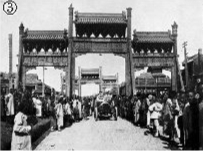 ③1907年参加“北京-巴黎汽车拉力赛”的意大利车队正通过东四牌楼,好奇的北京市民围观这辆不需要用牲口拉就能走的车。