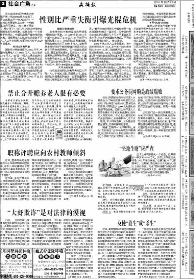 2000年第五次人口普查显示,当年出生性别比为116.9,其中第一胎出生性别比为107.12,第二胎就飙升至151.92,第三胎更高达160.3。从这组数据可以看出,第一胎的出生性别比基本正常,越往后就有更多的女胎被选择性堕胎,从而推高了出生性别比。